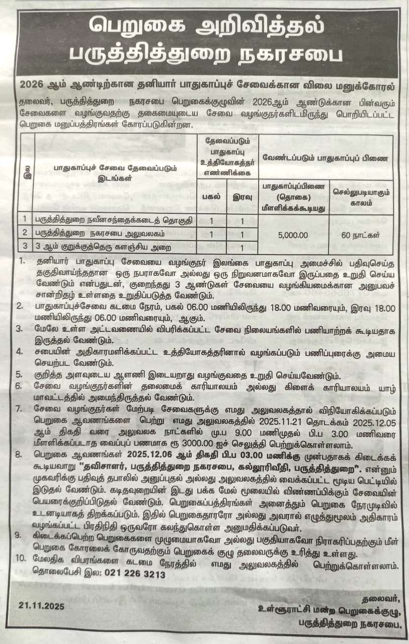 2026ம் ஆண்டுக்கான தனியார் பாதுகாப்புச் சேவையைப் பெற்றுக்கொள்வதற்கான கேள்வி கோரல் பத்திரிகை விளம்பரமானது 21.11.2025ம் திகதிய தினக்குரல் பத்திரிகையில் பிரசுரிக்கப்பட்டுளளது. இதற்கான பெறுகை ஆவணங்களை 2025.12.05ம் திகதி வரை அலுவலகத்தில் பெற்றுக்கொள்ளலாம். கேள்வியானது 2025.12.06ம் திகதி மாலை முன்பதாகச் சமர்ப்பிக்கப்பட வேண்டும்.